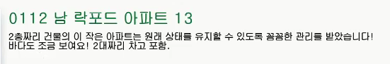 2층짜리 건물의 작은 아파트로 꼼꼼한 관리를 받으며 바다도 조금 보이는 아파트입니다.